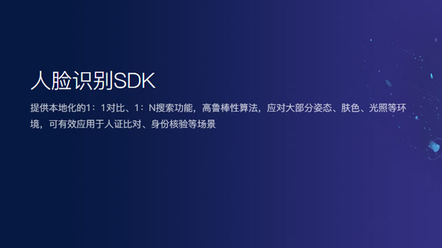 离线对比识别:提供本地化的1:1对比、1:N搜索功能,高鲁棒性算法,应对大部分姿态、肤色、光照等环境,可有效应用于人证比对、身份核验等场景