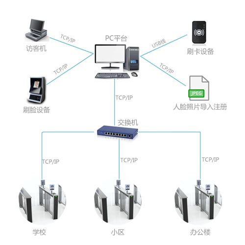 达辉人脸识别通行解决方案,系统构架简单、部署方便。可通过IP网络接入平台或软件,也可通过WEB实现基本设备配置;可联网运行,也可单机管理,通过与平台对接实现整体的门禁一卡通联动,极大提升了管控区域内的安全性、防护性。
